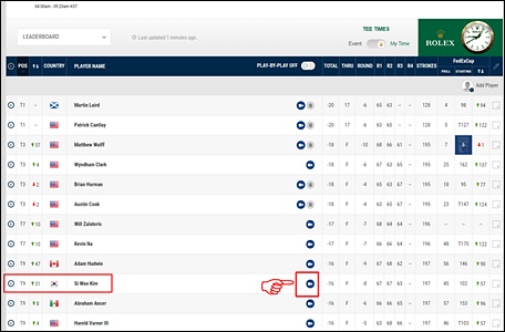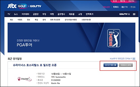 아무튼, jtbc 골프 홈페이지 메뉴에서 'TV' → '중계' → 'PGA 투어'로 가시면 '라이브스코어' 메뉴가 나오고 이 메뉴를 클릭하면 pga tour의 공식 홈페이지로 연결이 됩니다.