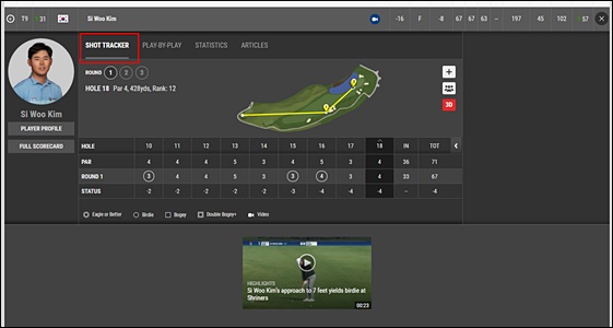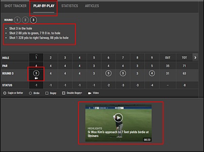 하단에는 선수별로 플레이 동영상이 VOD로 저장되어있어 홀별로 하이라이트 경기를 보실 수 있습니다. 중간 메뉴의 Play-by-play를 보시면 홀별로 매타 어떻게 플레이했는지 기록이 되어 있습니다.