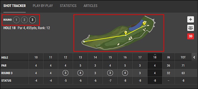 그리고, pga 실시간 스코어 리스트에서 선수 이름 옆에 있는 동영상 아이콘을 클릭하시면 선수별로 상세한 스코어 표가 나오게 되는데요. 각 라운드 그린 형태 홀 위치를 보실 수 있고, 홀별 타수를 세세하게 확인하실 수 있습니다.