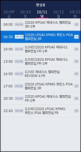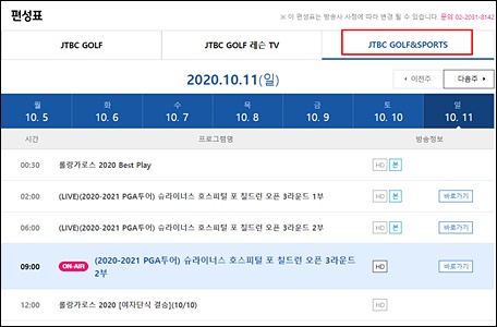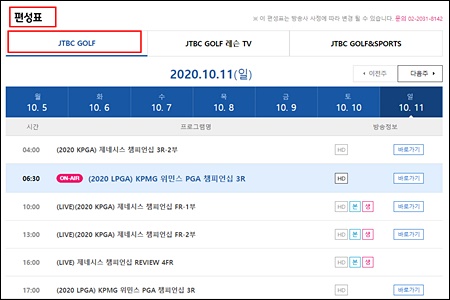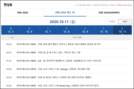 JTBC GOLF라고 되어 있는 편성표에는 LPGA와 KPGA 경기 중계 일정이, JTBC GOLF 레슨 TV라고 되어 있는 부분은 말 그대로 레슨 방송 스케줄이 나와 있습니다. 그리고 JTBC GOLF&SPORTS 편성표에는 PGA 경기 중계 일정을 보실 수 있습니다.