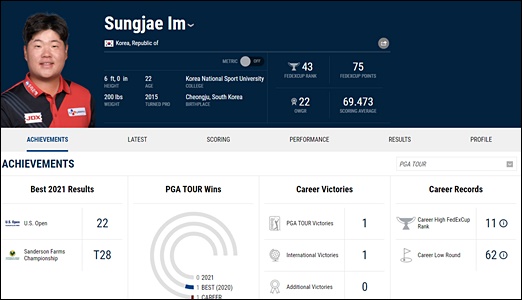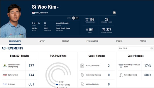 그리고, 선수 사진 밑에 'Player Profile'을 클릭하시면 해당 선수의 현재까지 PGA tour 기록들이 아주 자세히 기록되어 있습니다. 김시우 선수와 임성재 선수의 프로파일을 예로 보시면 될 것 같네요.